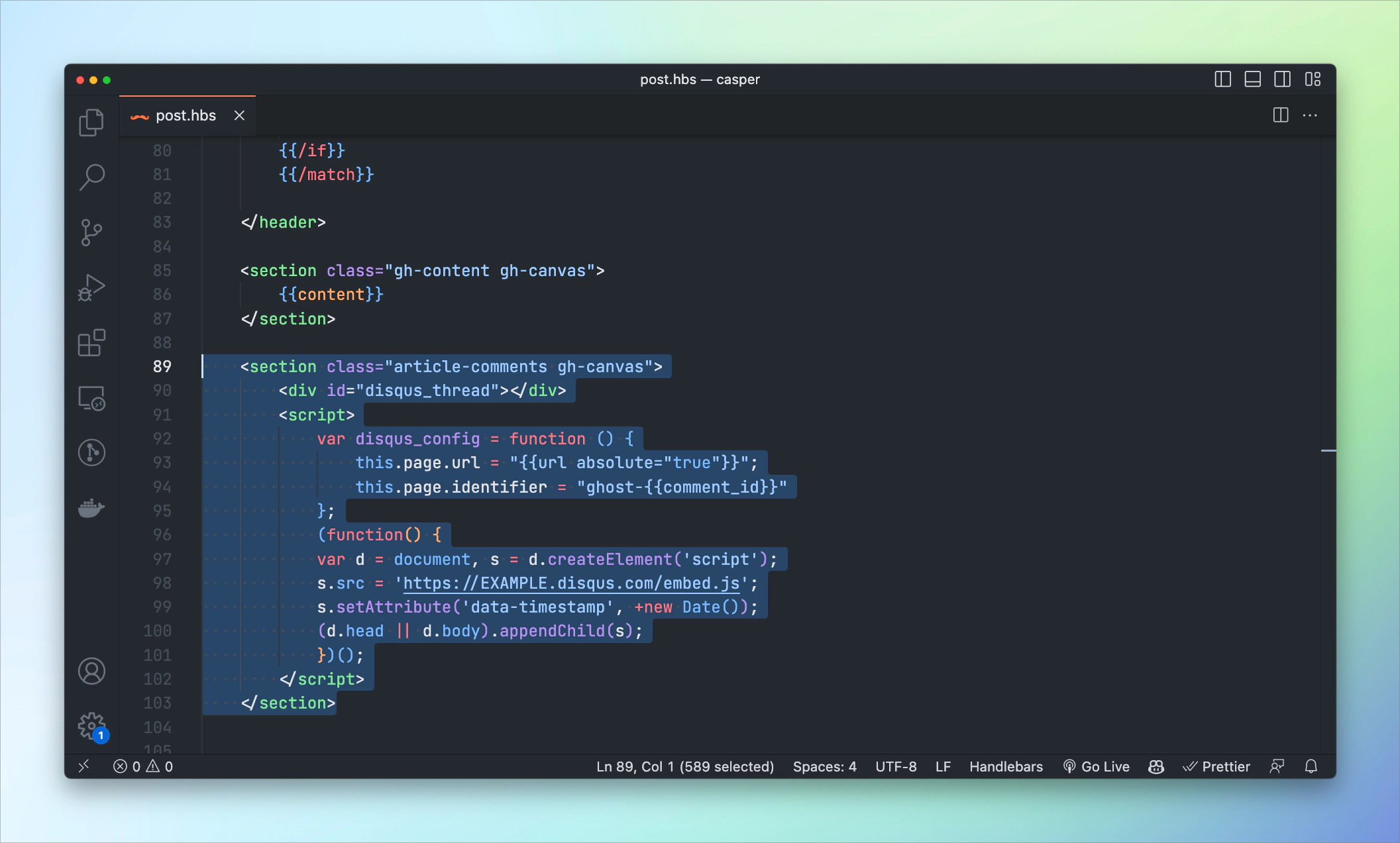 First, copy this Ghost-Specific Disqus comment code onto your clipboard. This is not the same as the Disqus Universal Code, but is customised specifically for Ghost themes: