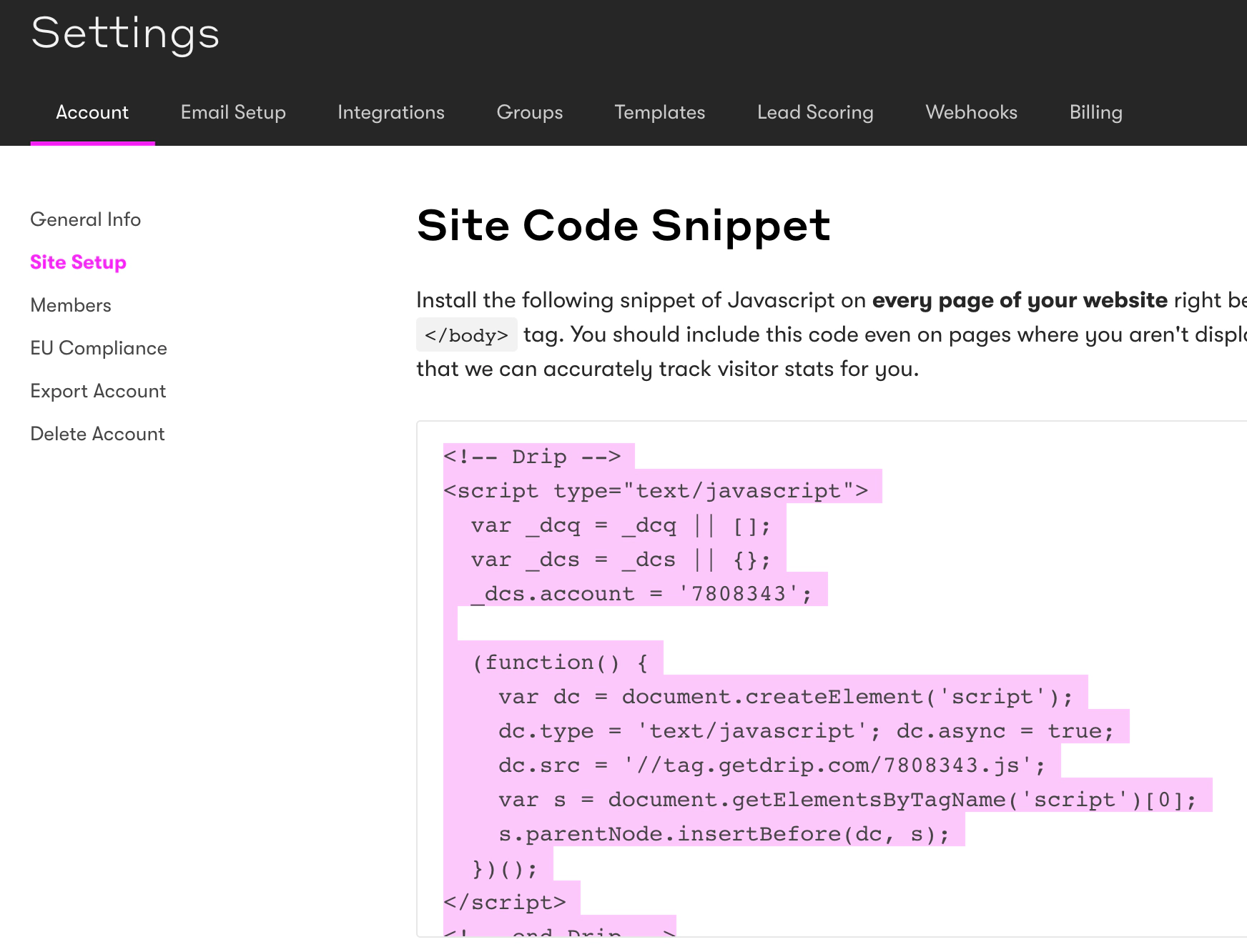 If you’d like to use the Drip widget forms on various parts of your site, go to your account settings in Drip and copy and paste the Javascript snippet in the site setup menu: