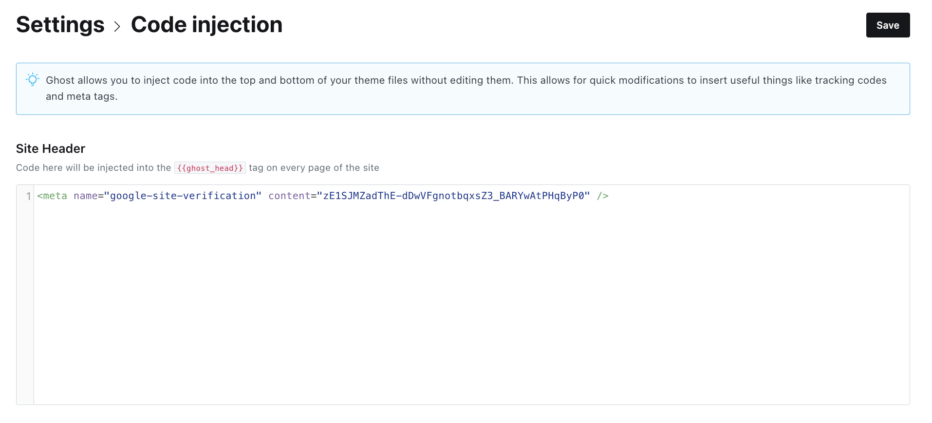 In Ghost, go to Settings > Code Injection. Paste the copied HTML tag into your Site Header.