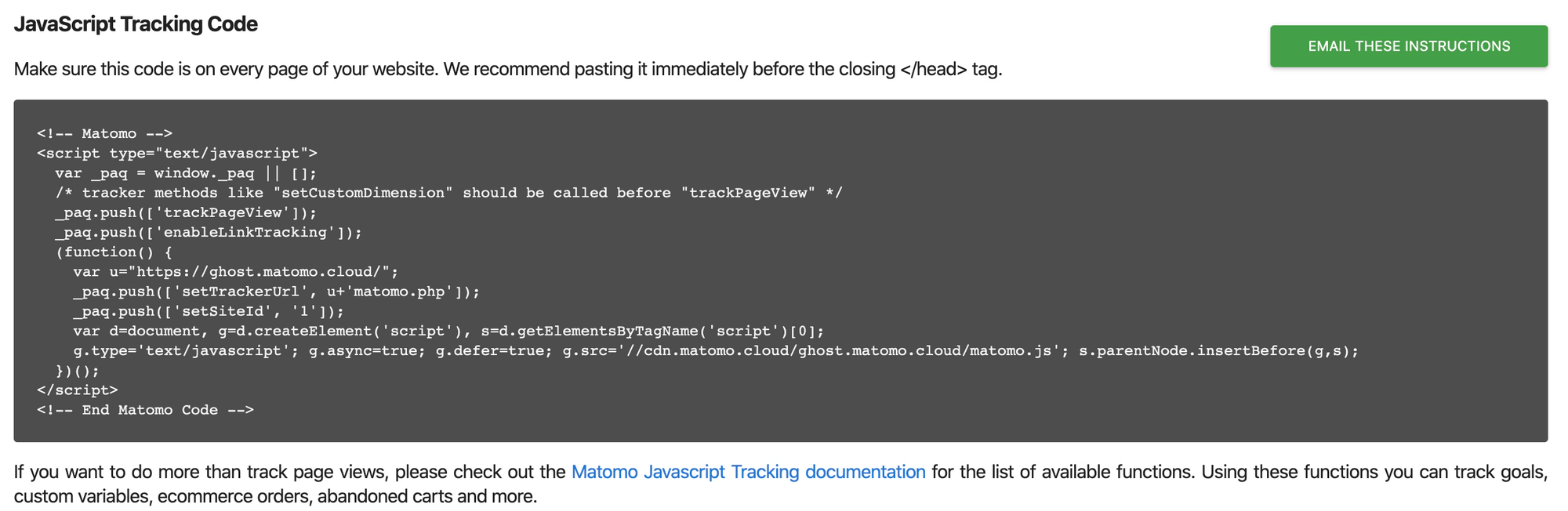 Your site is now fully integrated with Matomo. Enjoy privacy-focused data for your Ghost publication by logging in to check your dashboard. For more advanced configurations to track goals, custom variables, ecommerce orders, abandoned carts and more, use the official Matomo Javascript Tracking documentation.