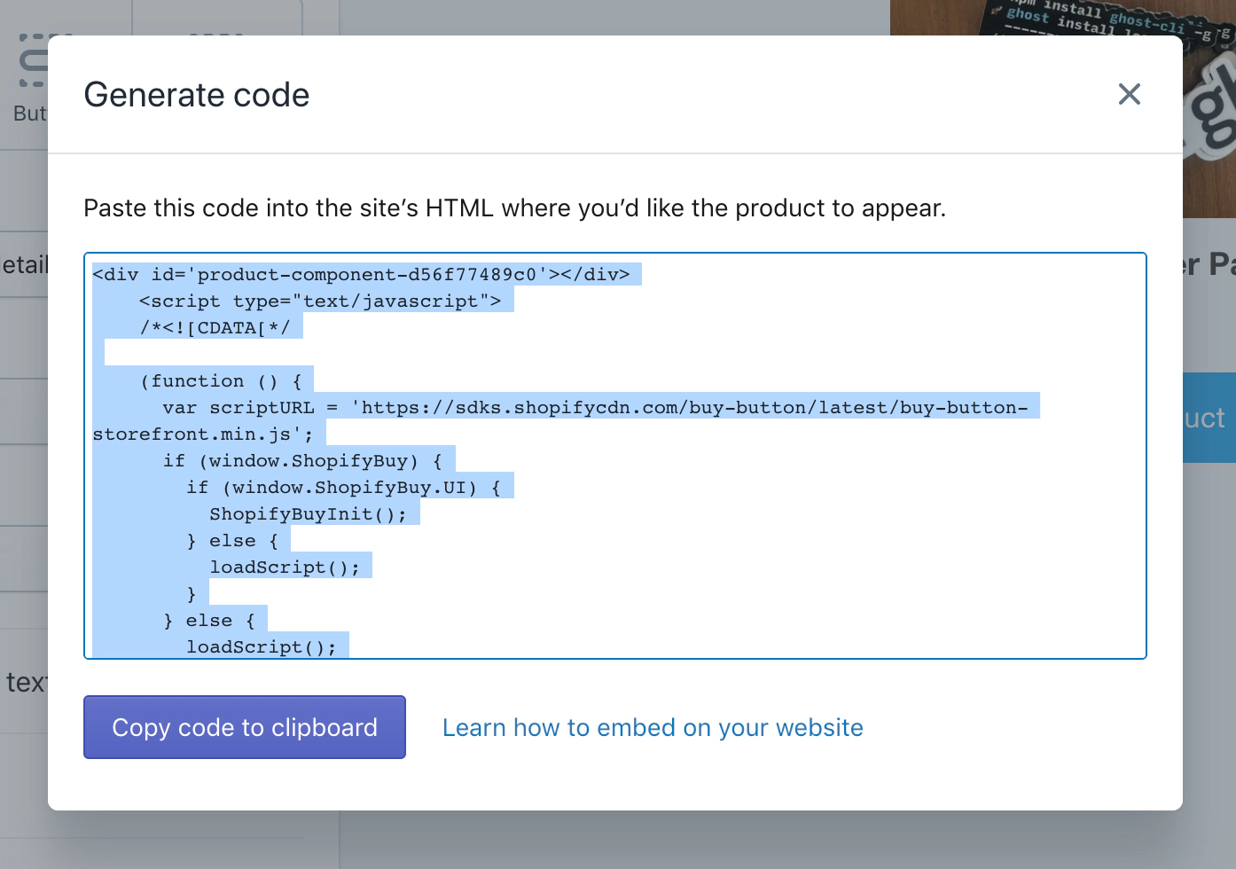 Once you’re happy with your Buy Button for your product in the preview, click the generate code button and copy the snippet provided to your clipboard: