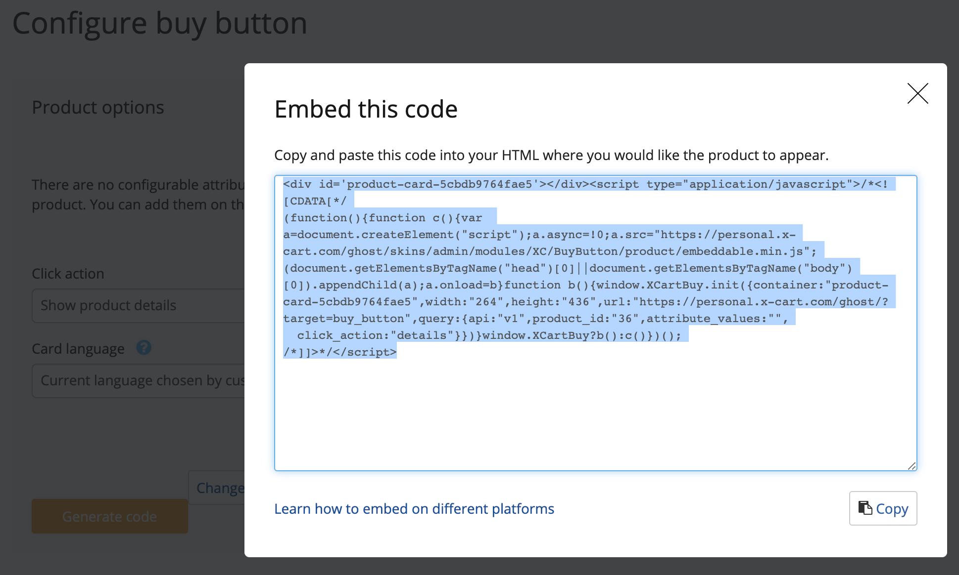 For a more advanced implementation, it is entirely possible to embed your X-Cart Buy Button directly within a Handlebars template file in the theme layer, or into a custom front-end.